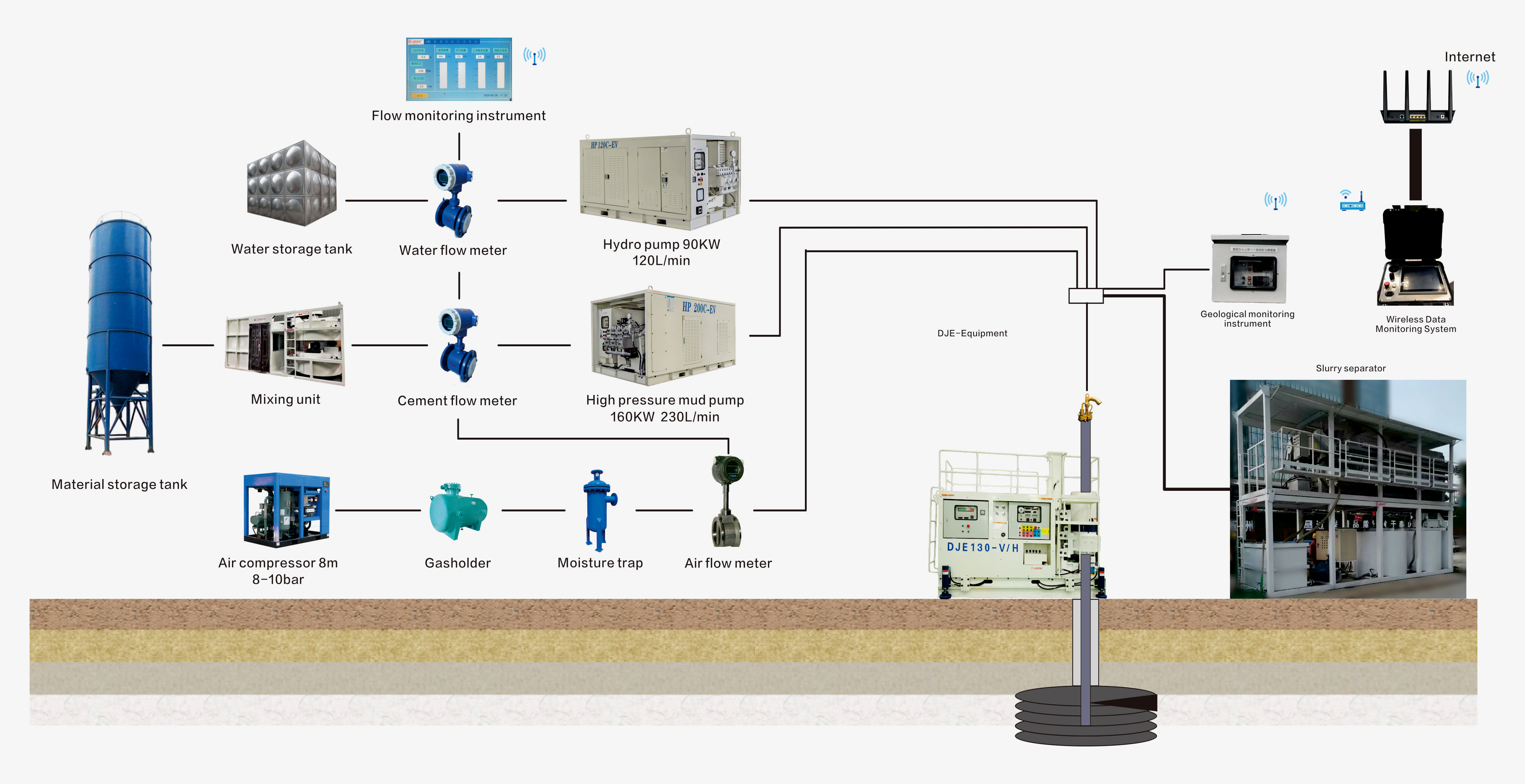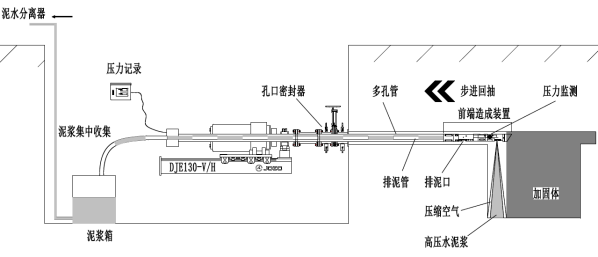 DJE工法又稱(chēng)全方位高壓噴射注漿工法,利用高壓水、高壓空氣和高壓水泥漿三種介質(zhì),通過(guò)獨(dú)特的多孔管和前端造成裝置(習(xí)慣稱(chēng)之為鉆頭),以高壓射流切割破壞周?chē)馏w,將硬化材料漿液加壓輸送、噴射、切削地層、混合、排泥、集中泥漿、泥漿固化運(yùn)送一系列工序作為監(jiān)控對(duì)象,是一種能進(jìn)行水平、垂直及傾斜和360°全方位地基加固的施工工法。該工法的最大特征是實(shí)現(xiàn)了孔內(nèi)強(qiáng)制排泥,并通過(guò)調(diào)整排泥量來(lái)控制地內(nèi)壓力,從而能夠有效地抑制隨噴射攪拌而產(chǎn)生的地基隆起或沉降,大幅度減少對(duì)環(huán)境的影響。